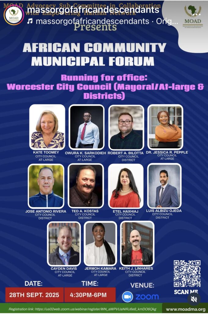 WORCESTER, Mass.—Yesterday, the African Community Municipal Forum, organized by MOAD, brought residents together with City Council candidates for a direct conversation on housing, equity, small business struggles, and community priorities.
