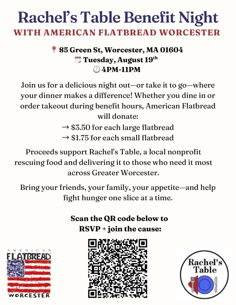 Looking for dinner plans that feel good and do good? Mark your calendars for Tuesday, August 19th, from 4PM to 11PM, because American Flatbread Worcester (85 Green St.) is teaming up with Rachel’s Table for a benefit night that’s all about food, family, and fighting hunger right here in our city.