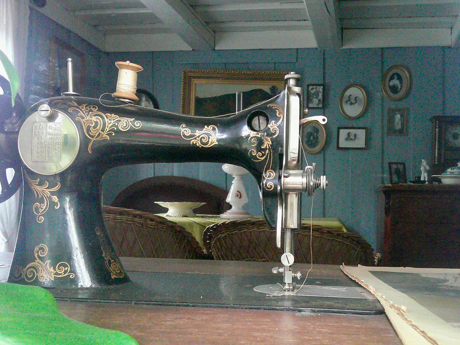 The path took me to the early 1900s cottages, not too different from our colonial cape style homes, and because the museum was closed, I peeked in windows. I zoomed in on objects with my little digital pocket cam (I get this seems creepy, but no one lives in these homes) and there it was… My grandmother’s sewing machine with its sleek ebony arches and gold-foil curlies. It all made sense. I had the same one sitting in my basement for 25 years, and here it is in a museum.