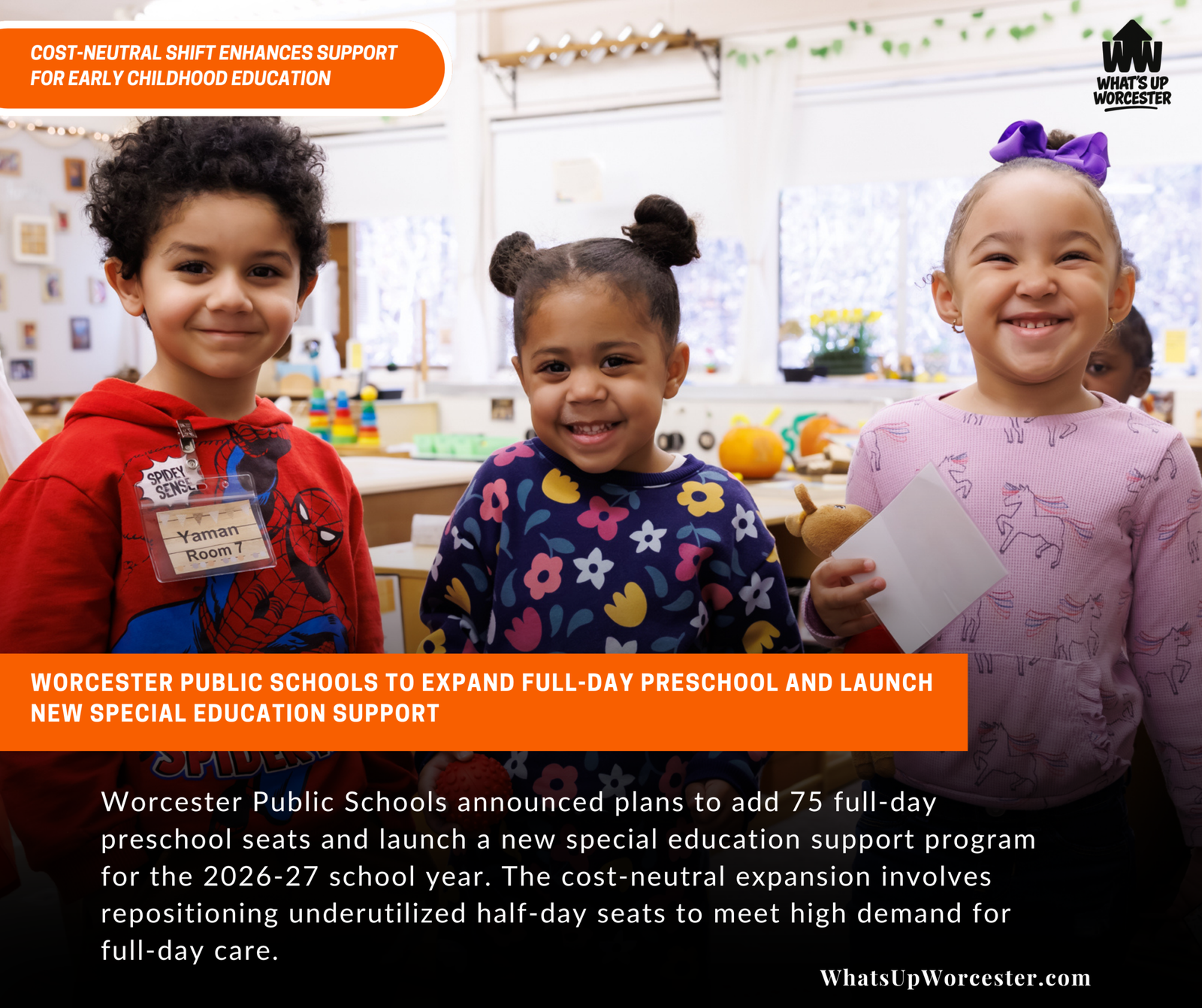 Worcester Public Schools announced plans to add 75 full-day preschool seats and launch a new special education support program for the 2026-27 school year. The cost-neutral expansion involves repositioning underutilized half-day seats to meet high demand…