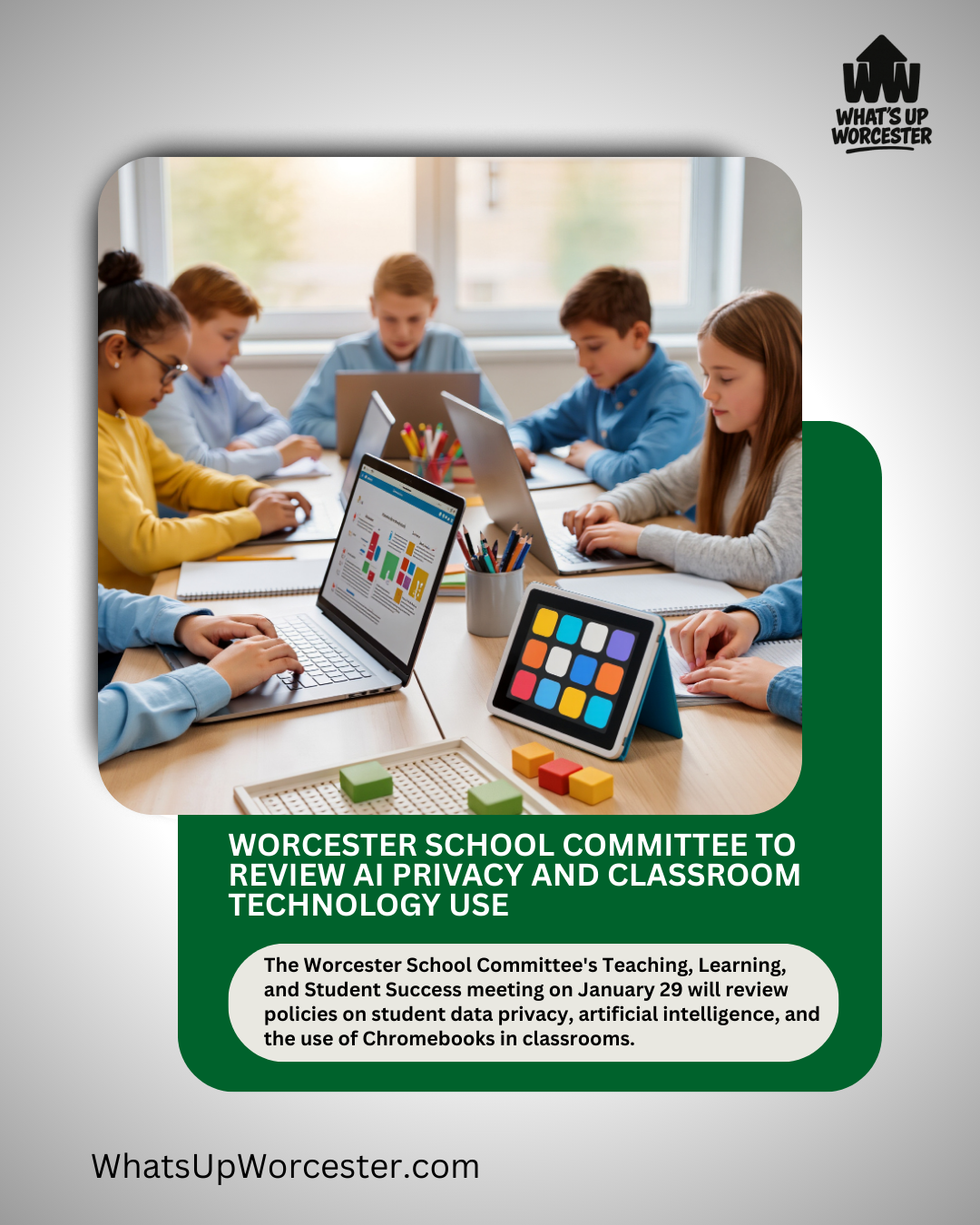 The Worcester School Committee's Teaching, Learning, and Student Success meeting on January 29 will review policies on student data privacy, artificial intelligence, and the use of Chromebooks in classrooms.