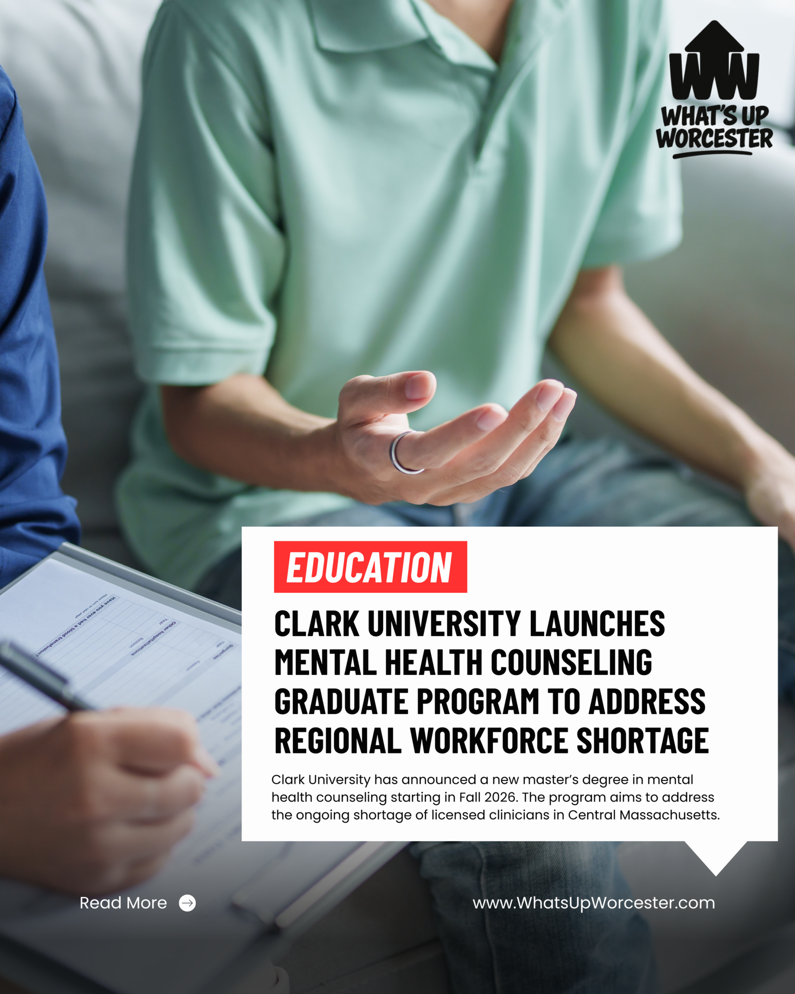 Health providers and policymakers have identified Central Massachusetts as a region experiencing limited access to mental health services. This includes long wait times for patients and a shortage of licensed clinicians. A graduate program based in Worcester that trains future counselors locally may contribute to expanding the regional workforce. This is particularly relevant if graduates choose to remain in the Central Massachusetts area to practice after completing their degree.