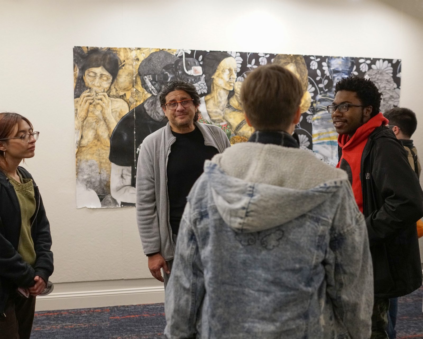 Vazquez's art is beautiful and defiant and yet it hurts no one. His largest piece shows iterations of Puerto Ricans living through colonialism and territorialism into this technological era. He shared his experiences of "otherness" in his closing…